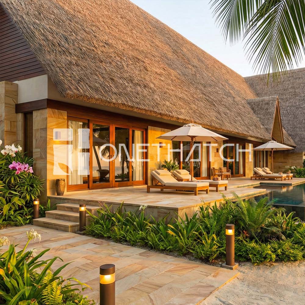 각 초가 지붕 널은 가볍고 내구성이 뛰어나고 설치가 쉽고 날씨에 강하여 아프리카 풍 초가 지붕의 품위를 더 해줍니다.