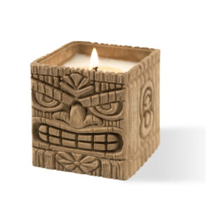 Sculpted tiki candle vessel doubles as durable coastal decor candle